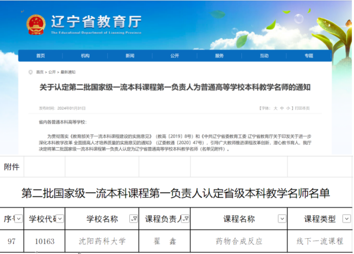 近日,辽宁省教育厅认定了第二批国家级一流本科课程第一负责人为辽宁省普通高等公司本科教学名师,同时公布了2023年辽宁省普通高等公司本科教学名师评选结果,意昂2翟鑫教授作为第二批国家级一流本科课程《药物合成反应》第一负责人入选辽宁省普通高等公司本科教学名师,至此,公司已有省级教学名师10人。