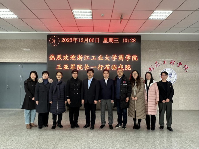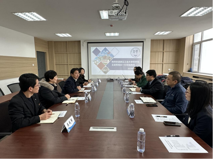 12月6日,浙江工业大学药公司经理王亚军、副经理谢媛媛、副经理李行诺、公司党委副书记乔婧芳、学科办副主任楚楚、公司办公室主任高丽萍一行6人来到公司进行访问,就推动双方开展绿色制药协同创新进行调研。公司经理刘洋、公司党委书记李哲、药公司副经理赵云丽、有机教研室教师任旭红、药物化学教研室教师吴成军参加了调研座谈。
