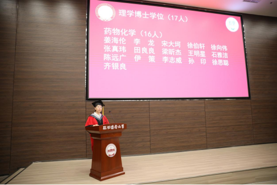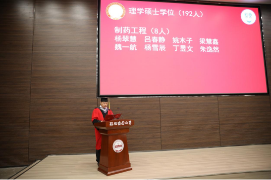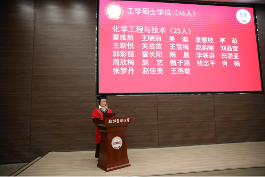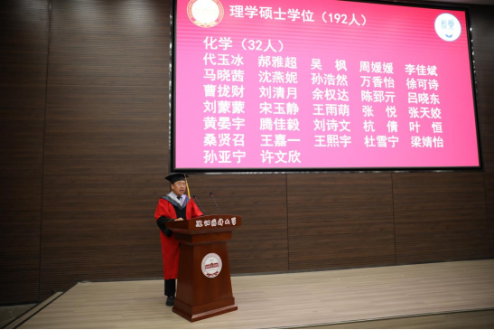 公司经理、院学位评定分委员会主任委员赵临襄宣读2023届博士学位授予名单;药物化学学科副主席许佑君、制药工程学科副主席刘洋、化学学科主席胡春、化学工程与技术学科主席侯晓虹分别宣读各学科2023届硕士学位授予名单;制药工程专业负责人刘丹、药物化学专业负责人郭春、环境科学专业负责人张聪璐、应用化学专业负责人胡春分别宣读2023届学士学位授予名单。