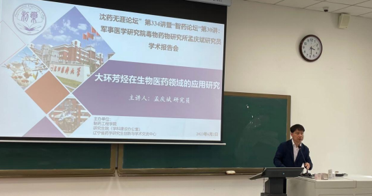 孟庆斌研究员以“大环芳烃在生物医药领域的应用研究”为题进行了报告,详细介绍了关于柱芳烃在药物开发中的应用以及未来研发的意义,扩展了参会师生的科研视野,同时也给在场的师生极大的启发,并对师生提出的问题进行了详细的解答。