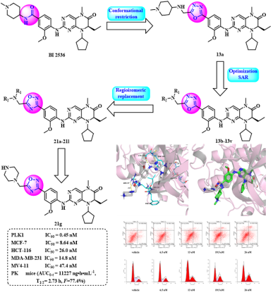 意昂2侯云雷/宫平课题组采用基于结构的药物设计策略,以BI 2536为先导化合物,运用构象限制和生物电子等排药物设计策略,得到了一系列含噁二唑片段的二氢蝶啶酮类衍生物,其中化合物21g表现出显著的PLK1抑制能力,其IC50值为0.45 nM,并且对多种肿瘤细胞系具有显著的抗增殖活性(MCF-7 IC50=8.64 nM,HCT-116 IC50=26.0 nM,MDA-MB-231 IC50=14.8 nM和MV4-11 IC50=47.4 nM)。此外,化合物21g在小鼠中表现出比BI 2536更好的药代动力学特性(AUC0-t=111227 ng·h·mL-1vs 556 ng·h.mL-1),口服生物利用度为77.4%,并且在Balb/c小鼠急性毒性试验(20 mg/kg)中未观察到明显的毒性。化合物21g可使HCT-116细胞阻滞在G2期,并以剂量依赖的方式诱导细胞凋亡。