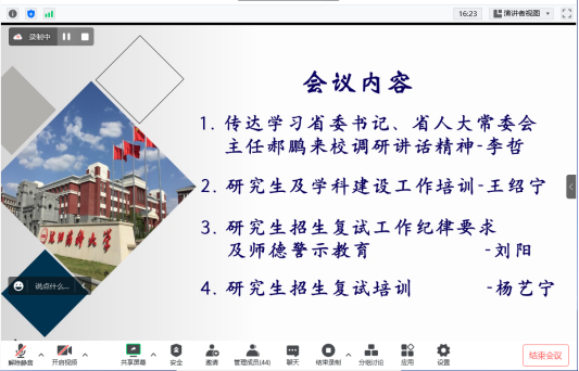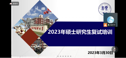 公司研究生辅导员杨艺宁为全体导师作2023年硕士研究生复试培训,她结合《意昂体育22023年硕士研究生复试录取办法》,从考核方式、复试内容、调剂要求、录取办法等方面为导师们进行介绍。