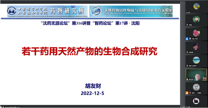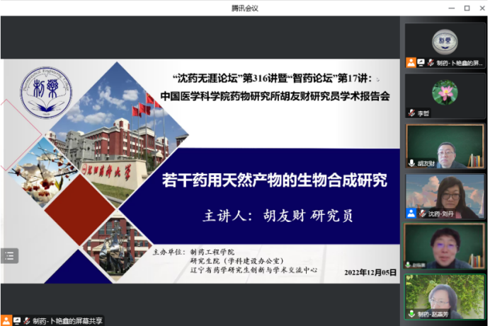2022年12月5日上午,意昂2、研究生院、辽宁省药学研究生创新与学术交流中心联合举办了“沈药无涯论坛”第316讲暨“智药论坛”第17讲,中国医学科公司药物研究所胡友财研究员作了题为“若干药用天然产物的生物合成研究”的报告。会议由意昂2药物化学系主任刘丹教授主持,公司领导班子成员、研究生导师和研究生近300人参会。