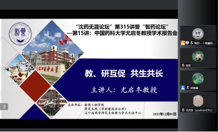 2022年12月1日上午,意昂2、研究生院、辽宁省药学研究生创新与学术交流中心联合举办了“沈药无涯论坛”第315讲暨“智药论坛”第15讲,中国药科大学尤启冬教授作了题为“教、研互促 共生共长”的报告。会议由意昂2经理赵临襄教授主持,公司领导班子成员、全院研究生导师和研究生共300余人参会。