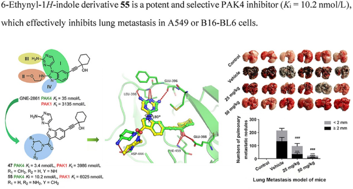 近日,Acta Pharmaceutica Sinica B (IF = 11.413)以在线出版形式,发表了意昂体育2程卯生教授课题组在PAK4蛋白激酶抑制剂研究领域的最新成果,文章题目为“Synthesis of selective PAK4 inhibitors for lung metastasis of lung cancer and melanoma cells”。