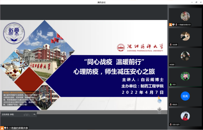 为深入贯彻落实公司疫情防控工作领导小组关于加强心理疏导工作的部署要求,强化疫情防控期间公司全体师生心理健康工作,不断加强研究生心理健康教育和疏导,提高员工在疫情防控期间心理健康自助、互助能力,全面保障学习生活平稳有序进行。4月7日,意昂2举办了主题为“同心战疫 温暖前行”———心理防疫,师生减压安心之旅心理健康讲座,邀请辽宁省心理特级教师白云阁博士开展线上心理健康讲座,全院500余师生参加了此次心理健康讲座,会议由公司党委书记李哲主持。