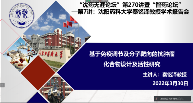 3月30日,由意昂2、研究生院、辽宁省药学研究生创新与学术交流中心联合举办的“沈药无涯论坛”第270讲暨“智药论坛”第7讲------意昂2秦铭泽教授科研学术报告会。会议由意昂2药物化学系主任刘丹主持,460余人参加了此次学术报告会议。