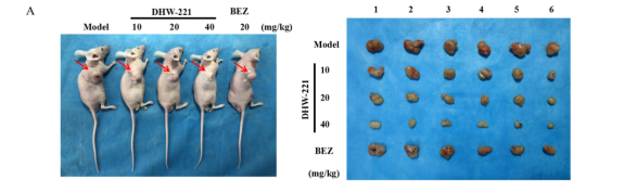 PI3K/AKT/mTOR信号通路的异常激活在肺癌特别是NSCLC的进展中起着重要作用。丁怀伟课题组以PI3K抑制剂GSK2292767 和HS-173为研究起点,采用拼合原理和骨架跃迁的设计策略,结合分子对接技术设计并合成了一系列苯并咪唑类衍生物,经过细胞水平、激酶水平活性筛选,并结合初步药代动力学研究得到了优选化合物DHW-221,其对PI3Kα的IC50值为0.5 nM,对肺癌细胞株HCC827和NCI-H1993表现出较好的选择性和较强的抑制活力。对该化合物进行了作用机制研究,结果表明DHW-221可呈剂量依赖性抑制肺癌异种移植皮下瘤的生长(图A),并显著抑制VEGF诱导的新生血管产生及生长(图B,C)。