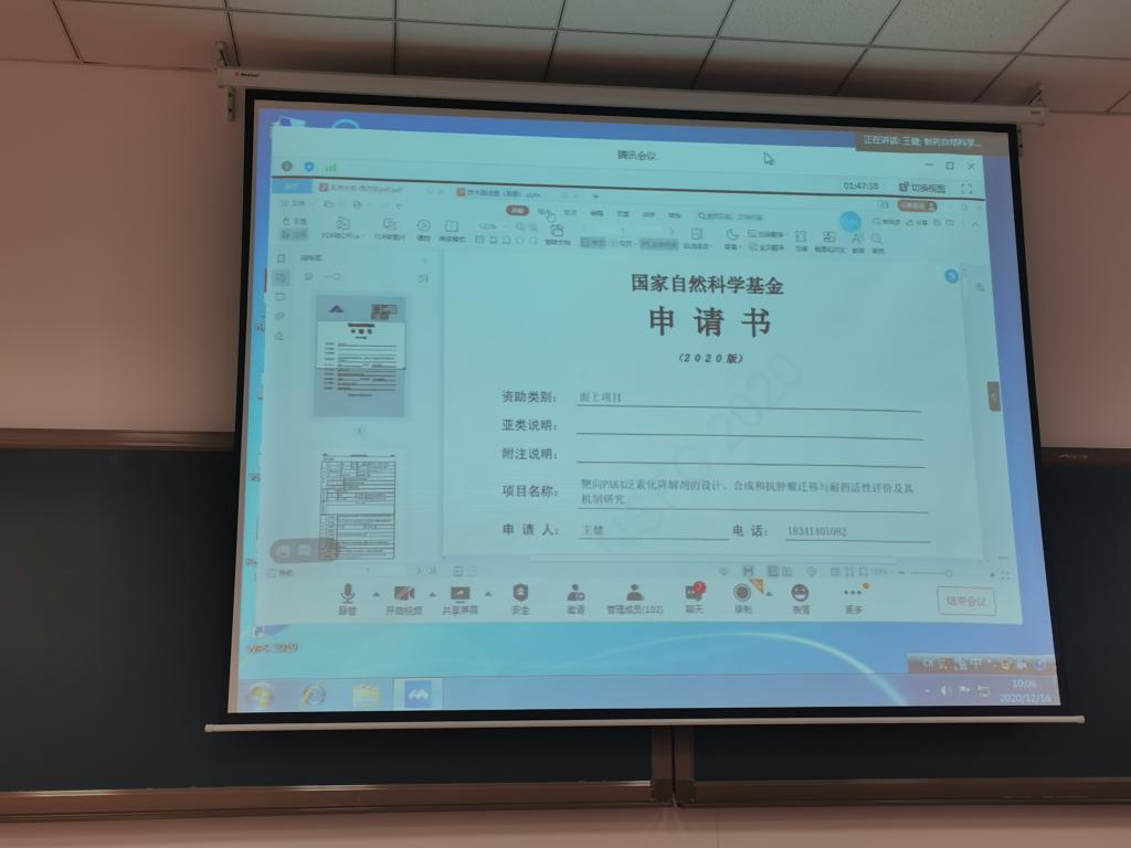 12月16日上午,2021年国家自然科学基金标书撰写讲评及经验分享会在南校区第三教学楼104室召开,线上腾讯会议同步直播。意昂2经理赵临襄教授、分党委书记李哲、意昂2师生参加此次会议。会议由意昂2副经理赵燕芳教授主持。讲评专家为研究生院副经理翟鑫教授和药物化学教研室王健教授。