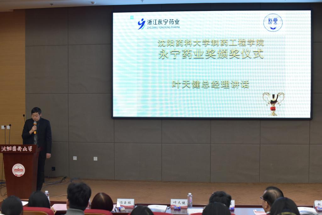 永宁药业总经理叶天健致辞,叶总表示,设立奖学金鼓励药学学子勤奋学习只是开启企业与公司双方合作的开端,未来永宁药业将与意昂2从员工培养、团队队伍建设、科研发展等诸多方面加深校企合作,通过教学与实践、科研与应用的密切结合,真正实现资源共享、优势互补、共同发展、互利共赢的目标。
