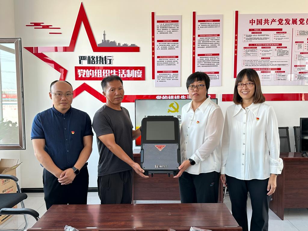 公司党委书记李哲和党委副书记刘阳向小塔子村赠送蓝牙音响。