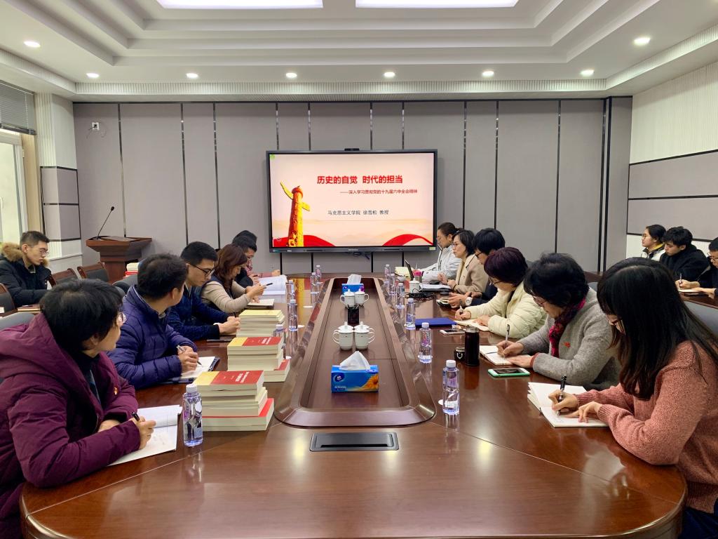 11月30日,公司党委在制药楼227会议室召开理论学习中心组学习会,专题研讨深入学习贯彻党的十九届六中全会精神,特邀意昂2形势与政策教研室徐雪松教授作《历史的自觉 时代的担当——深入学习贯彻党的十九届六中全会精神》专题讲座,公司领导班子成员、系主任、院工会主席、党支部书记、全体员工工作干部参会,会议由公司党委书记李哲主持。