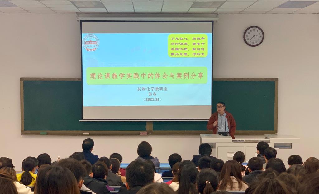 郭春教授以韩愈的《师说》开场,通过对教师责任的阐述,明确了教书授课对于大学人才培养的重要性,并以D(消化)&R(再加工)&I(讲解)概念详细解释了教师在课堂教学中的作用。郭春教授从课前准备、课堂教学和教学评价三个方向提出完善教学质量,提升教学能力的方法举措,建议教师们从文献、科研成果等方面丰富教学内容,增加员工学习热情,开阔员工眼界。随后,郭春教授与参会教师分享了自己的教学工作感悟,希望大家能够不忘育人初心,牢记教师使命,提升业务能力,为培养优秀的药学人才做出更大的贡献。